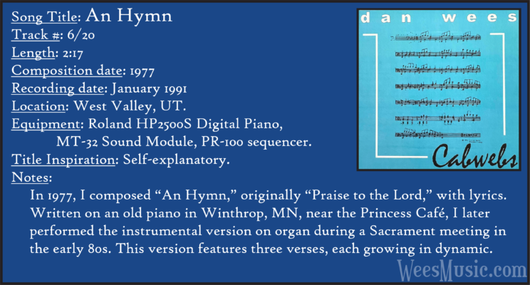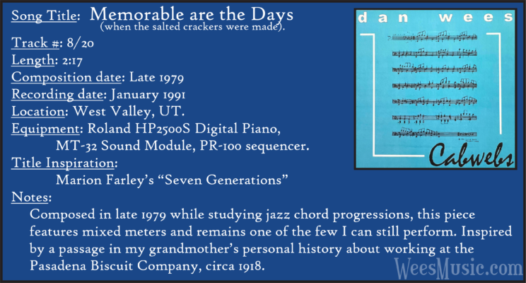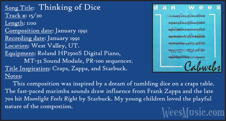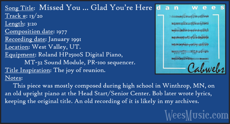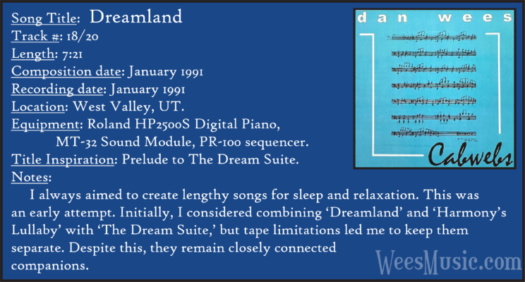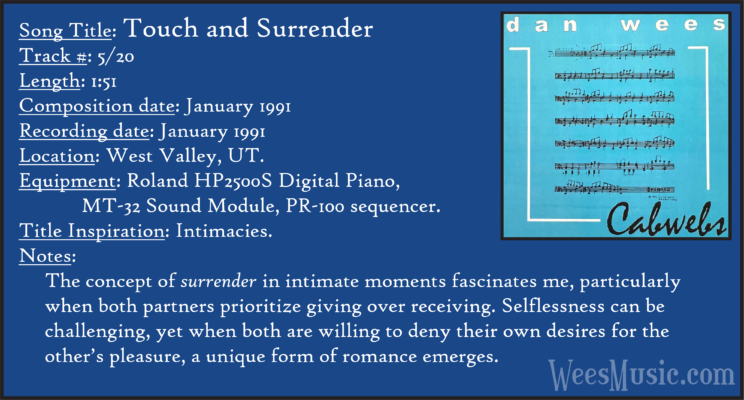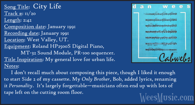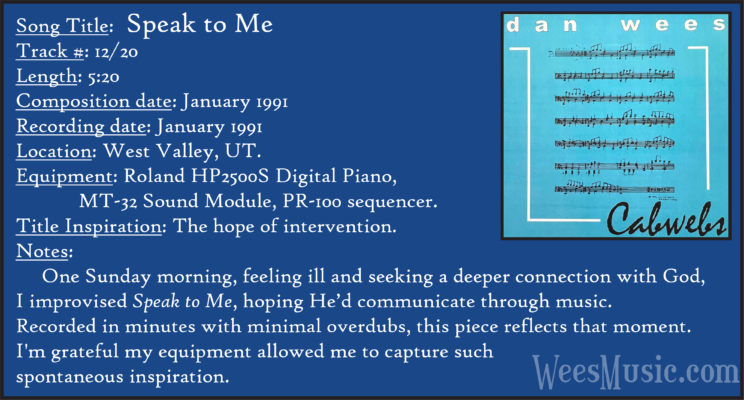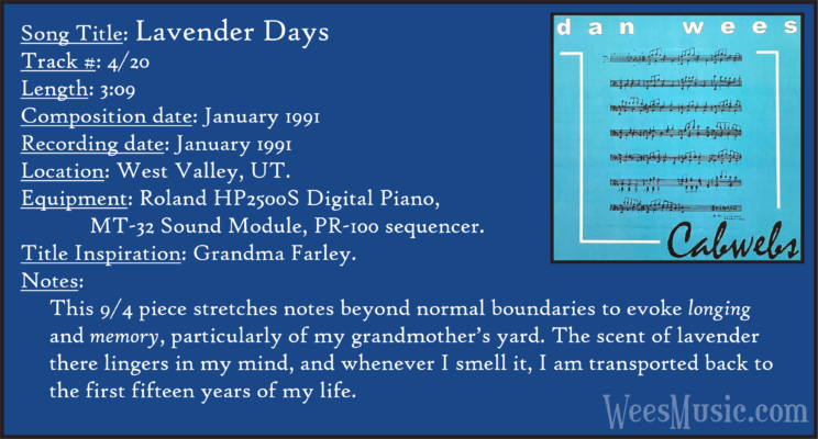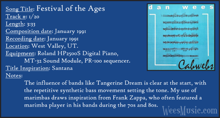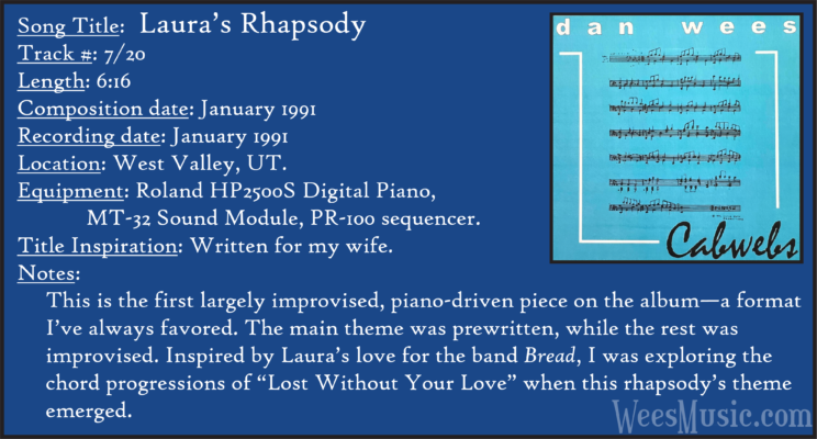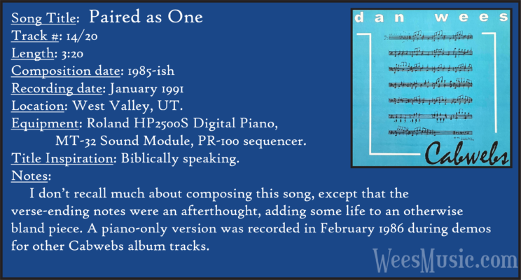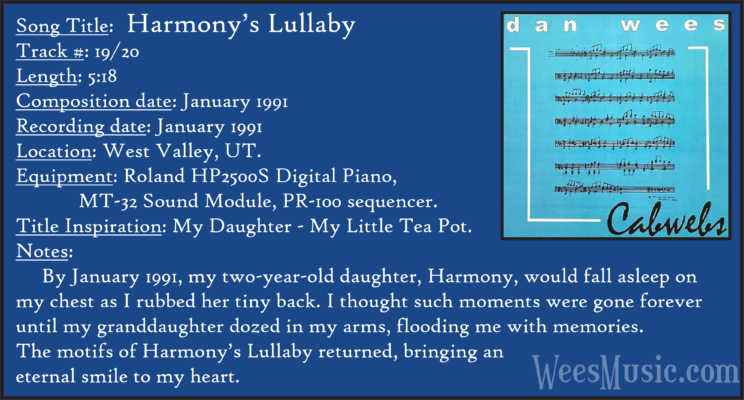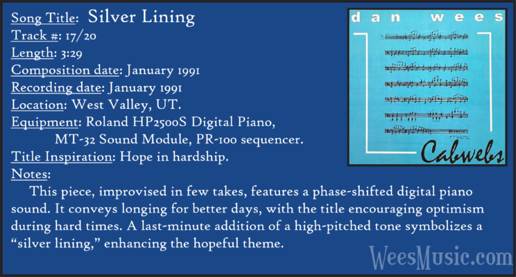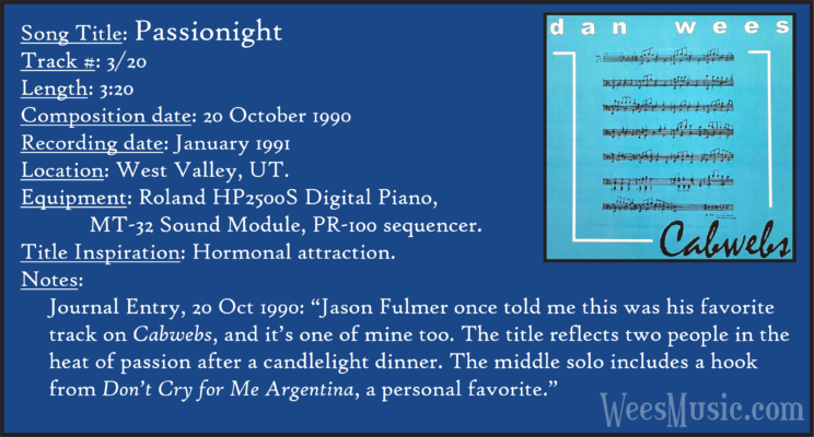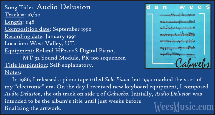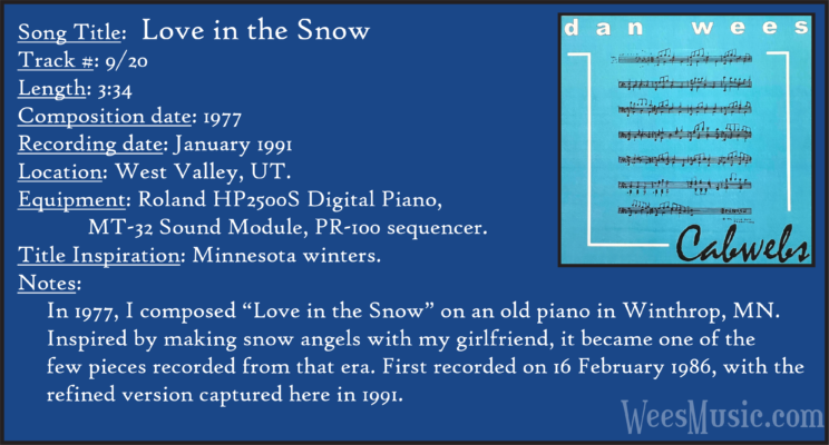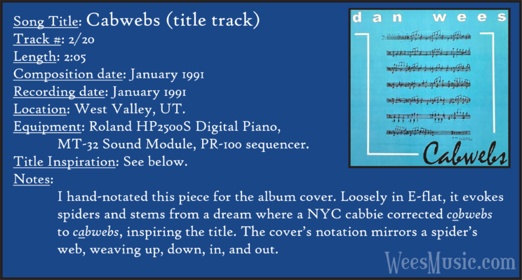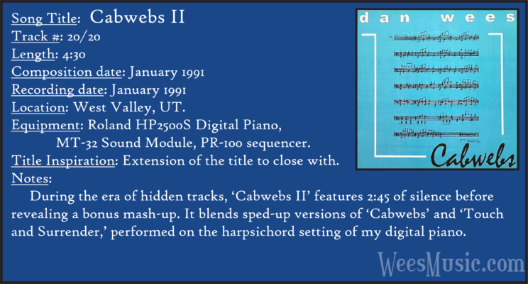 Cabwebs - The Entire Recording Track 1: Festival of the Ages Track 2: Cabwebs Track 3: Passionight Track 4: Lavender Days Track 5: Touch and Surrender Track 6: An Hymn Track 7: Laura's Rhapsody Track 8: Memorable are the Days Track 9: Love in the Snow Track 10: The Jetty Track 11: City Life Track 12: Speak to Me Track 13: Missed You...Glad You're Here Track 14: Paired as One Track 15: Thinking of Dice Track 16: Audio Delusion Track 17: Silver Lining Track 18: Dreamland Track 19: Harmony's Lullaby Track 20: Cabwebs II